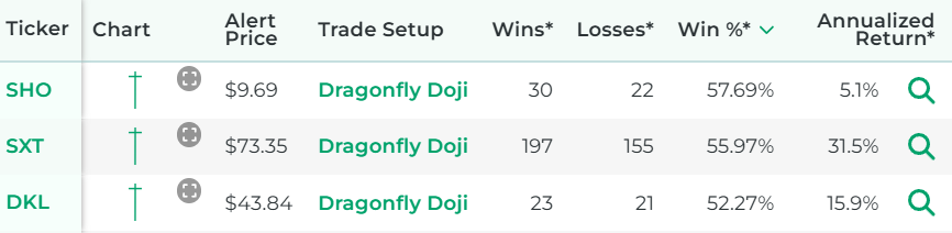 You can find them by using our Dragonfly Doji Candle scanner. It's a free tool we offer here at Stock Market Guides. It uses our proprietary scanning technology to find stocks that just had a dragonfly doji candlestick on a daily chart.