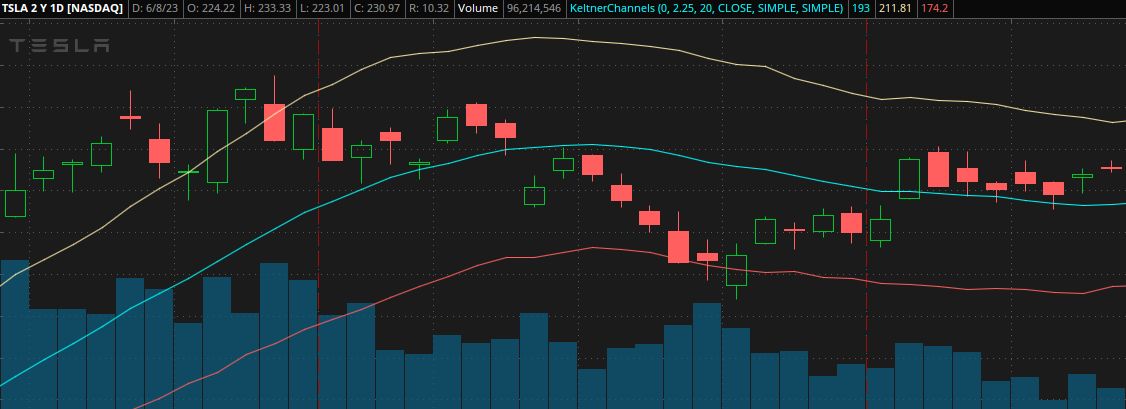 The above image is a stock chart for Tesla. You can see the Keltner Channel lines in that image: the tan line, blue line, and red line.