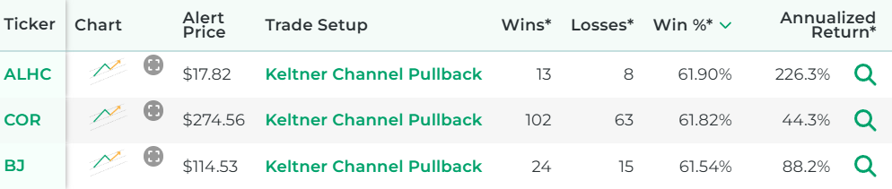 You can find them by using our Keltner Channel Pullback scanner. It's a free tool we offer here at Stock Market Guides. It uses our proprietary scanning technology to find stocks that have Keltner Channel pullbacks.