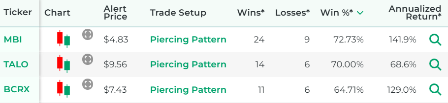You can find them by using our Piercing Pattern scanner. It's a free tool we offer here at Stock Market Guides. It uses our proprietary scanning technology to find stocks that just had a piercing candlestick pattern on a daily chart.