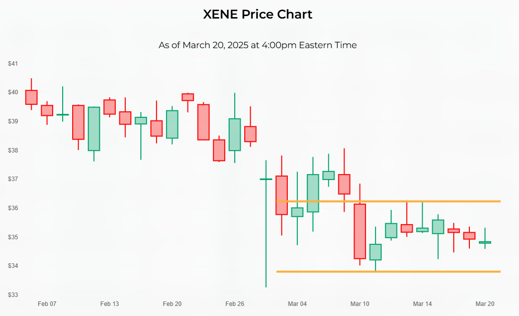 The entry criterion for our Triple Bottom trading strategy is very simple. You can see in the stock chart below for XENE that the entry price would be right around $38.