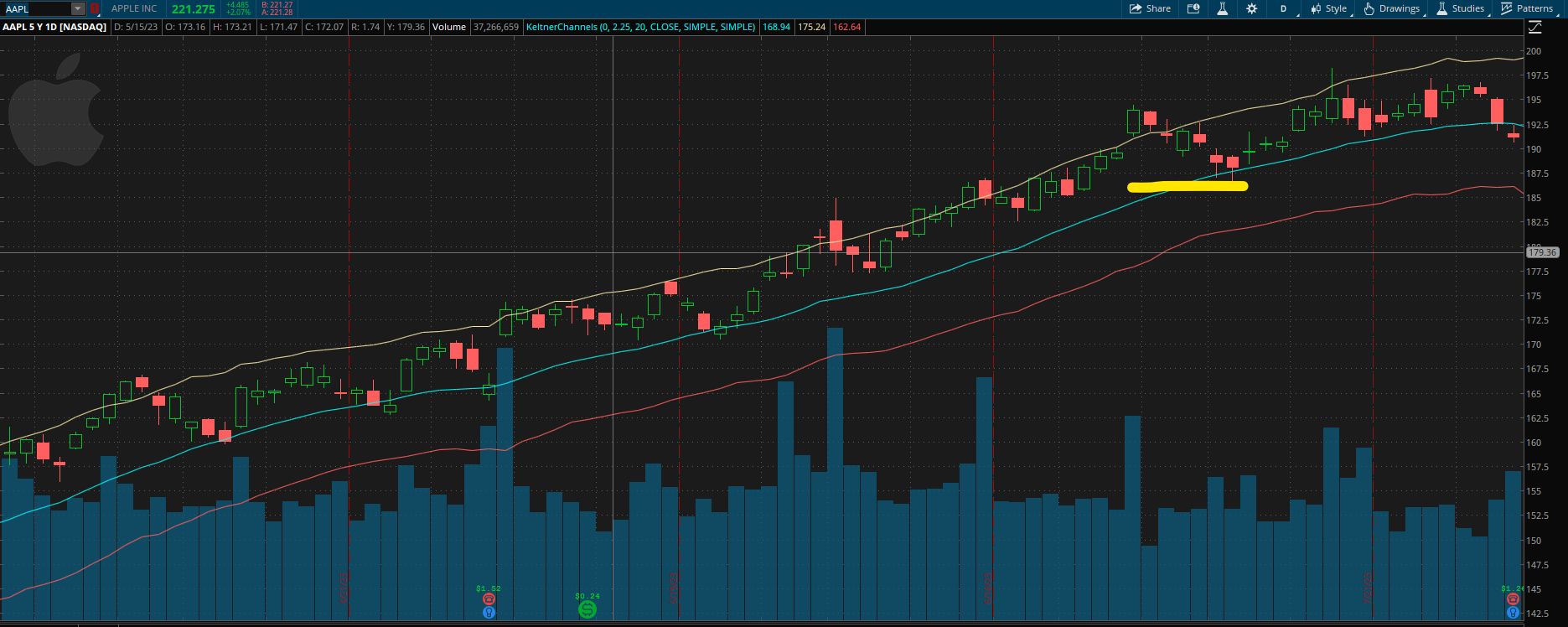 As you can see, there is some discretion for how you frame or define an uptrend when looking at a stock chart, but a Keltner channel can help clear this up.