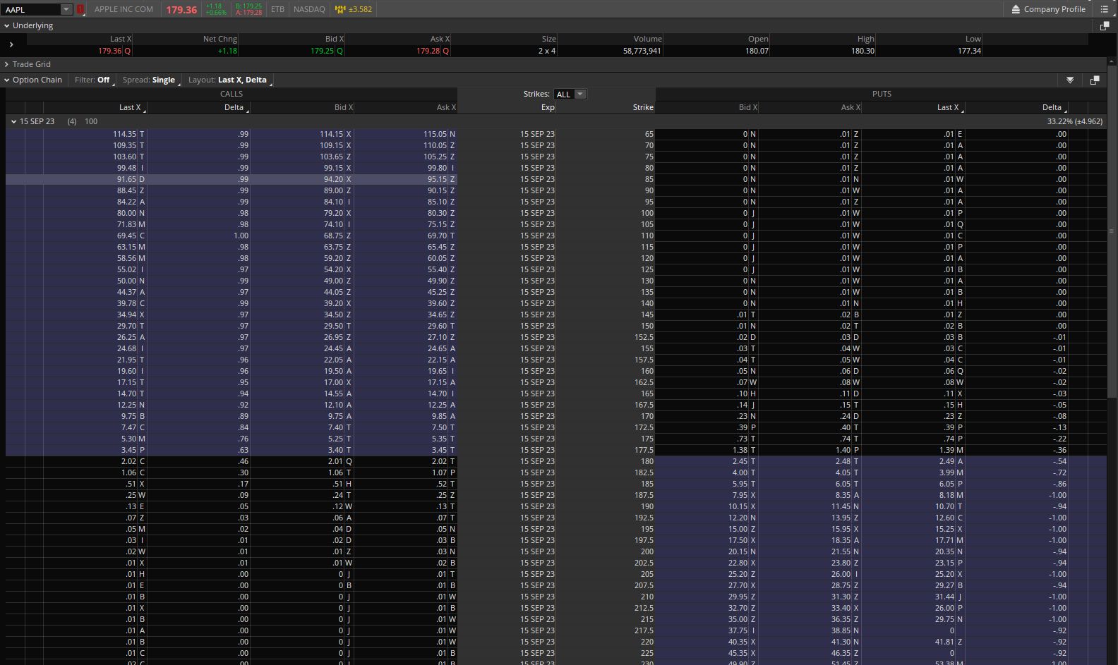Any call options where the stock price (179.36 in this example) is lower than the strike price will be out of the money. There would be no financial incentive to exercise the option because you could just buy the stock itself for less. The options with a black background are out of the money.