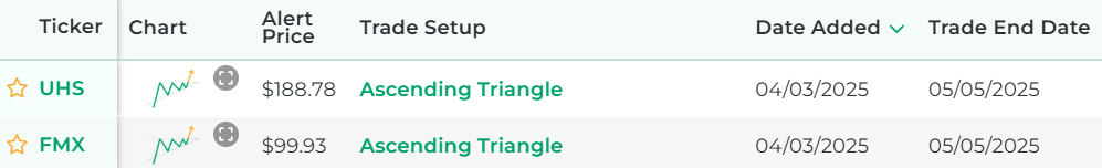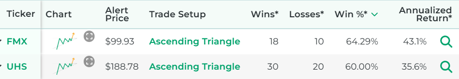 It's powered by our proprietary stock scanner, which searches once per day for stocks that have ascending triangle patterns.