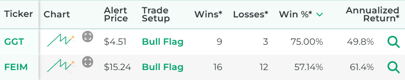 *Wins, Losses, Win Percentage, and Annualized Return are referring to how the stock performed in backtests for the Trade Setup indicated.