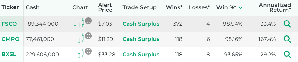 These are stocks that have more cash on hand than they have short term liabilities according to our scanner. You can sort columns or add filters in order to fine-tune the scan results.