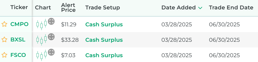 In the case of finding stocks that have cash surpluses each day, our scanner looks for stocks that, as of the most recent trading day, had more cash on hand than short term liabilities as per its more recent quarterly report.