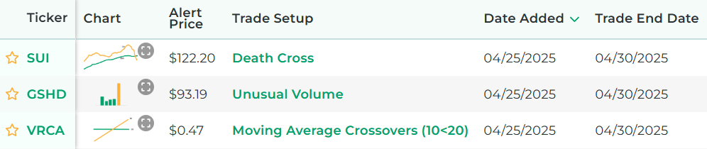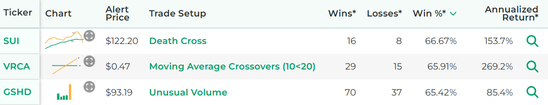 *Wins, Losses, Win Percentage, and Annualized Return are referring to how the stock performed in backtests for the Trade Setup indicated.