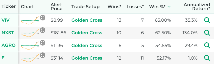 *Wins, Losses, Win Percentage, and Annualized Return are referring to how the stock performed in backtests for the Trade Setup indicated.