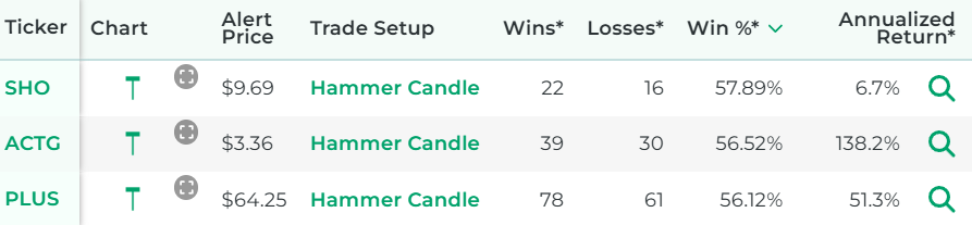 *Wins, Losses, Win Percentage, and Annualized Return are referring to how the stock performed in backtests for the Trade Setup indicated.