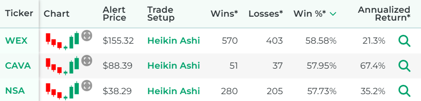 *Wins, Losses, Win Percentage, and Annualized Return are referring to how the stock performed in backtests for the Trade Setup indicated.