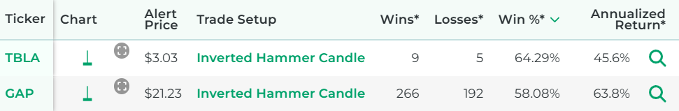 *Wins, Losses, Win Percentage, and Annualized Return are referring to how the stock performed in backtests for the Trade Setup indicated.