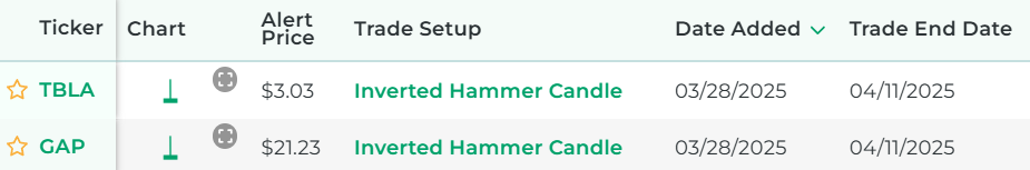 It's powered by our proprietary stock scanner, which searches once per day for stocks that have inverted hammer candles.