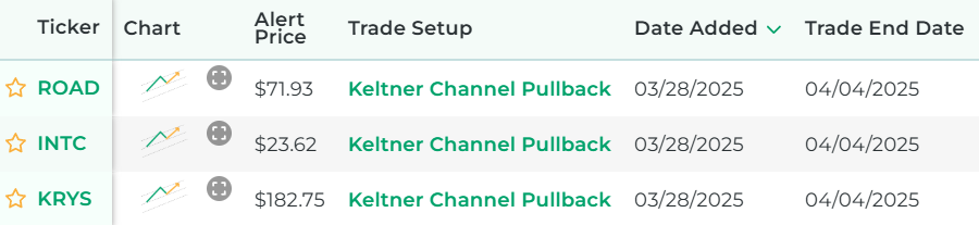 It's powered by our proprietary stock scanner, which searches once per day for stocks that have Keltner Channel pullbacks.