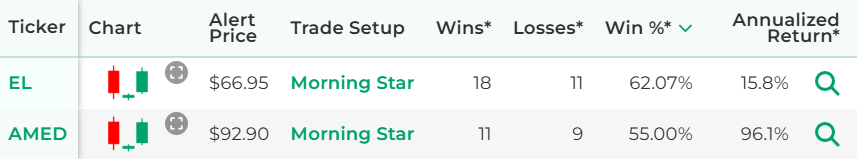 *Wins, Losses, Win Percentage, and Annualized Return are referring to how the stock performed in backtests for the Trade Setup indicated.
