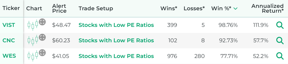 *Wins, Losses, Win Percentage, and Annualized Return are referring to how the stock performed in backtests for the Trade Setup indicated.