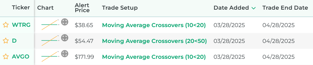 It's powered by our proprietary stock scanner, which searches once per day for stocks that have moving average crossovers.