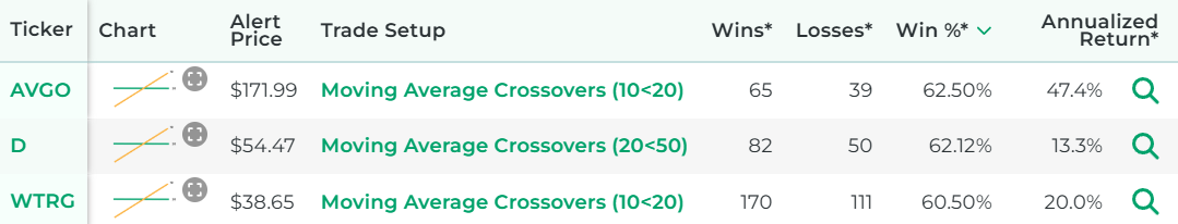 *Wins, Losses, Win Percentage, and Annualized Return are referring to how the stock performed in backtests for the Trade Setup indicated.