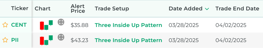 It's powered by our proprietary stock scanner, which searches once per day for stocks that have three inside up patterns.
