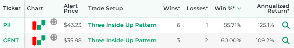 *Wins, Losses, Win Percentage, and Annualized Return are referring to how the stock performed in backtests for the Trade Setup indicated.