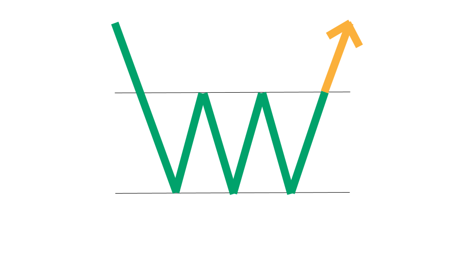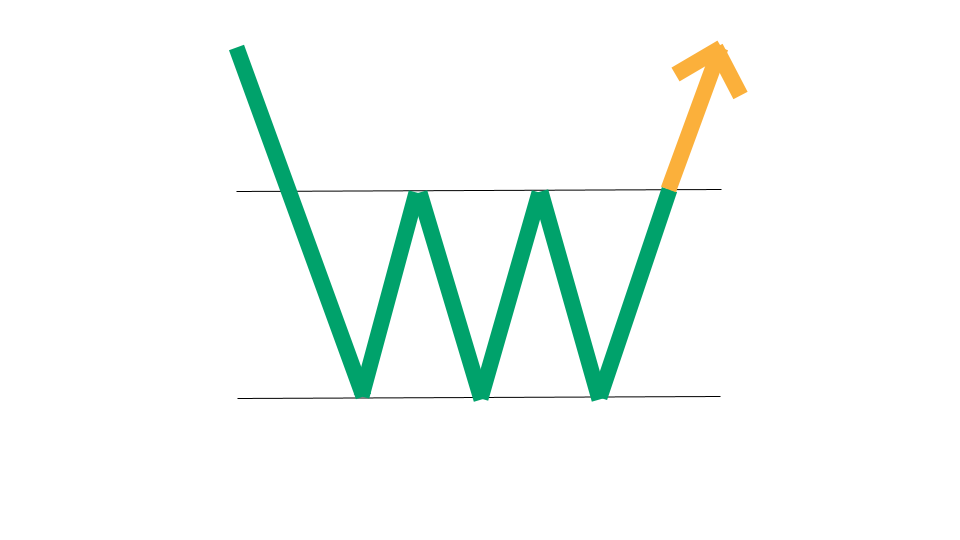 When you look at it on a stock chart, a triple bottom looks like the letter "W", but with one extra "v" wedged in the middle. The price bars are patterned in such a way that there are three troughs with two price peaks in the middle.