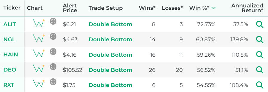 *Wins, Losses, Win Percentage, and Annualized Return are referring to how the stock performed in backtests for the Trade Setup indicated.